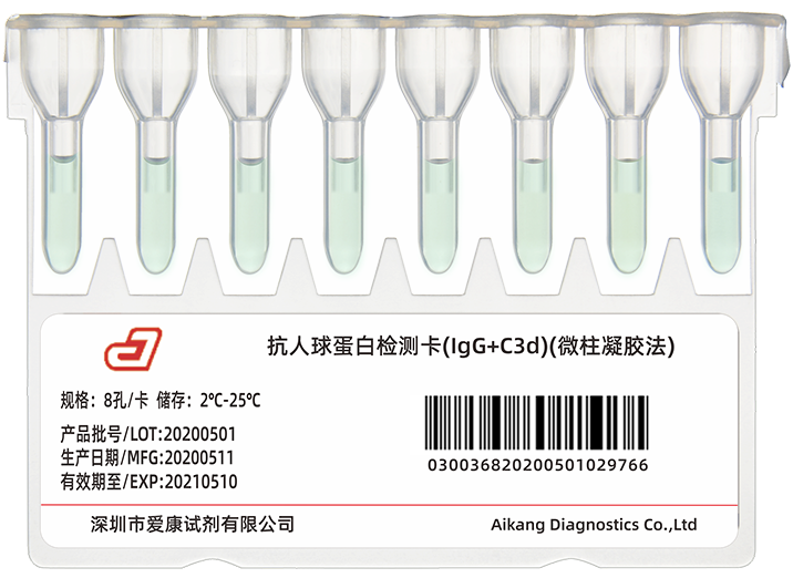 采用微柱凝膠法,8孔卡設(shè)計(jì),用于直接抗人球蛋白試驗(yàn)和間接抗人球蛋白試驗(yàn)