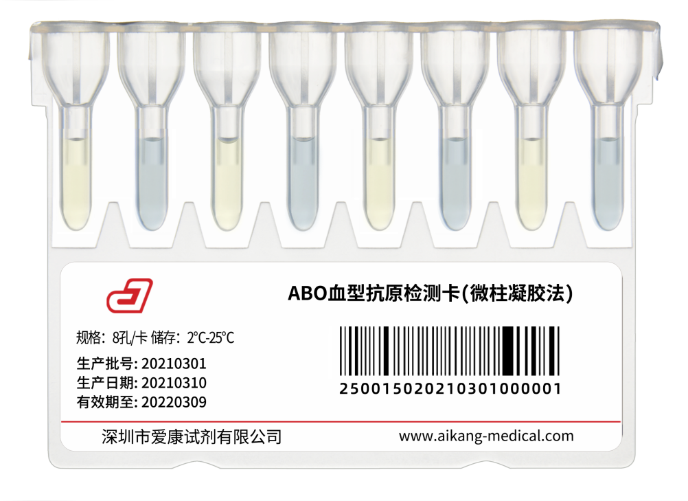 采用微柱凝膠法,8孔卡設計,適用于ABO血型正定型檢測,可作為血型復查的常規(guī)檢測卡